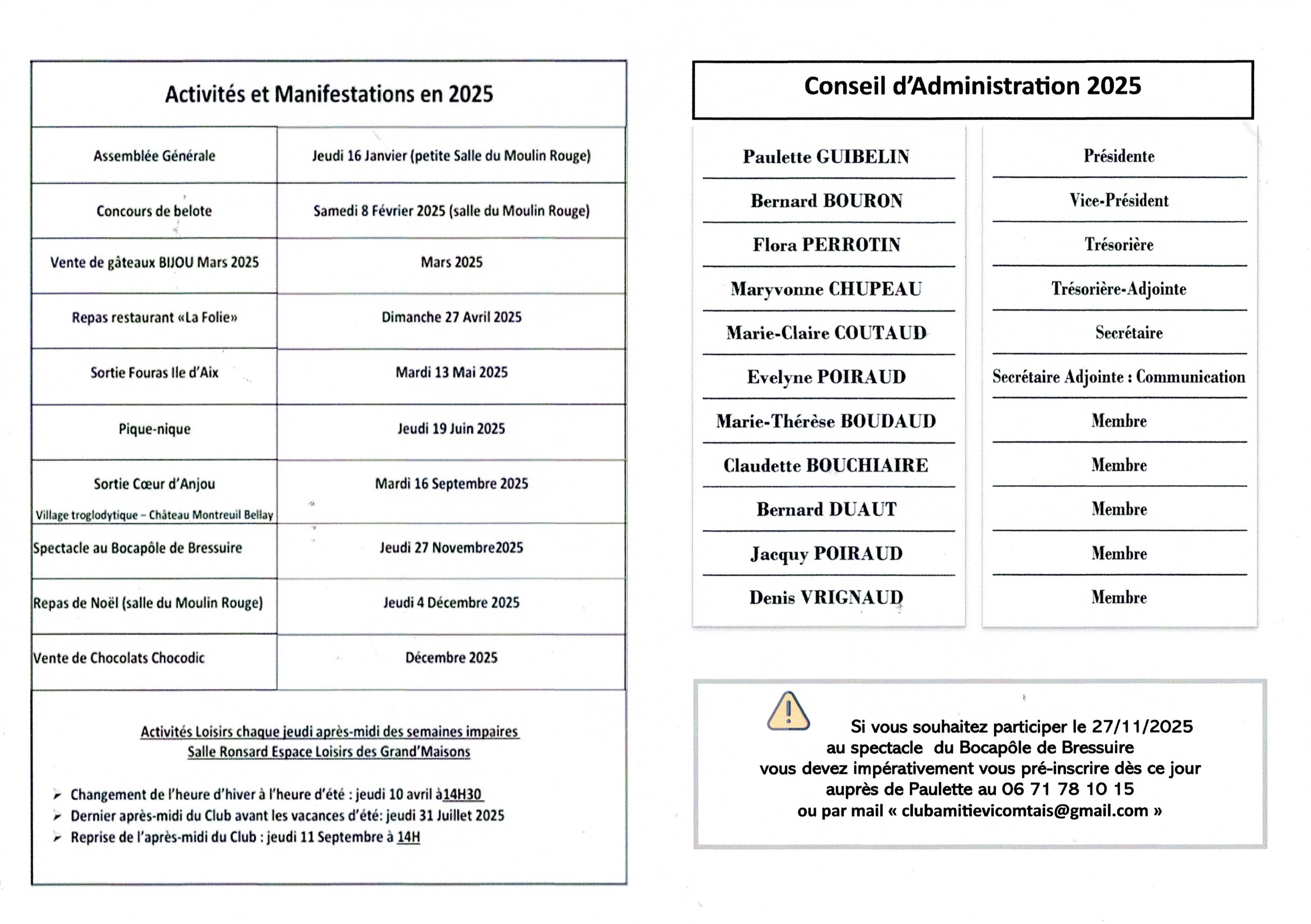 L'adhésion 2025 au Club de l'Amitié est de 16 € par adhérent.